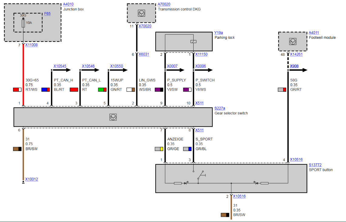 GETRIEBE_GAENGEfrom6_gaengeto8_gaenge(From 6 speed to 8 speed) - In case of a CAS error code related to PLOCK, a ground wire (brown) must be added to CAS ECU pin 11.